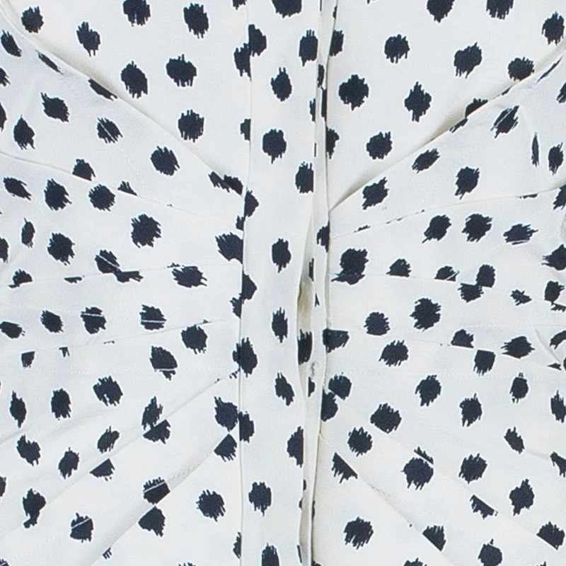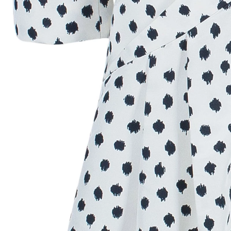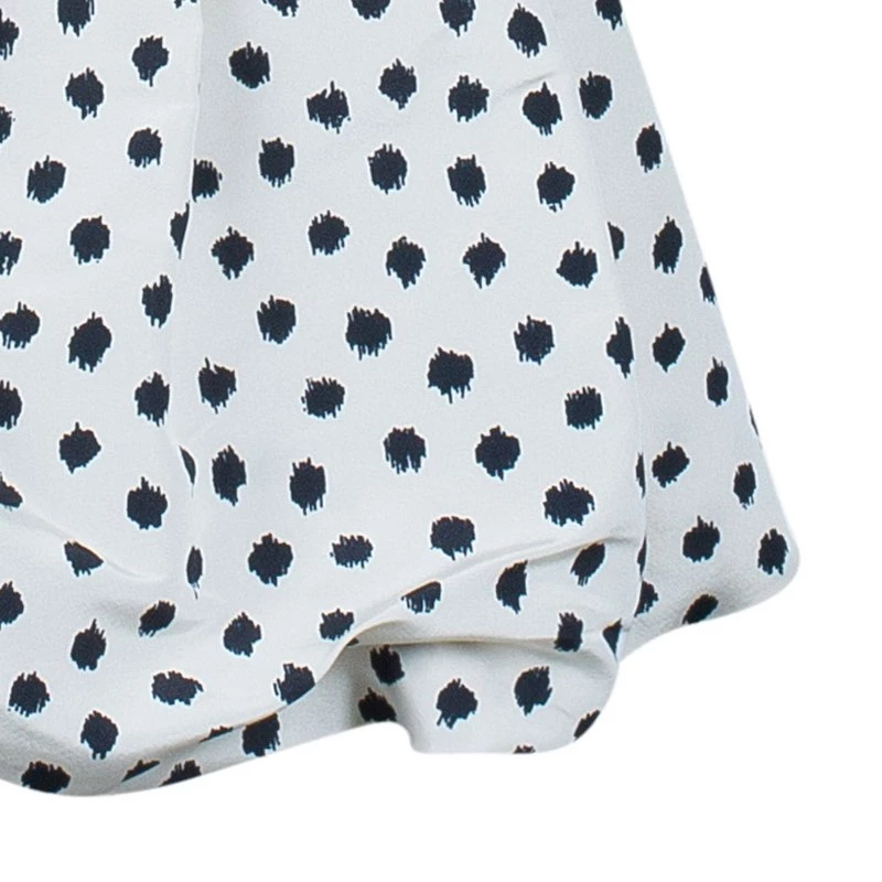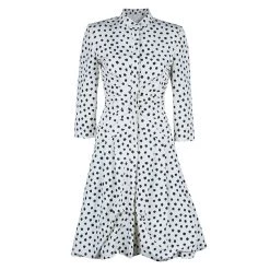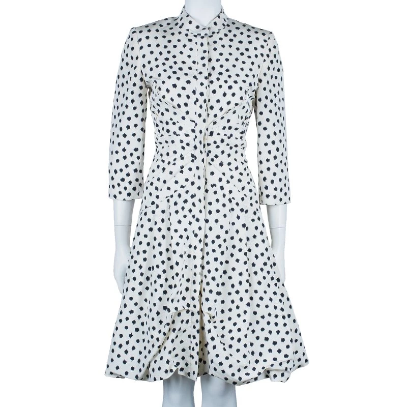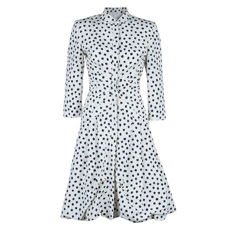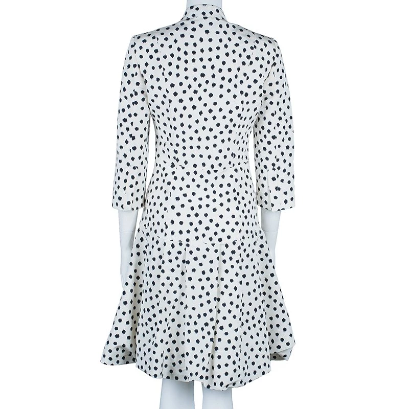 Adorn this stunning Oscar De La Renta dress in coat pattern and discover an all new fashionista in you. It has been crafted in silk and looks simply gorgeous with polka dots. The long sleeves and collared neck lends it the formal look of a coat. The fluffy pleated look at the bottom is simply amazing. This is a must have for this spring!