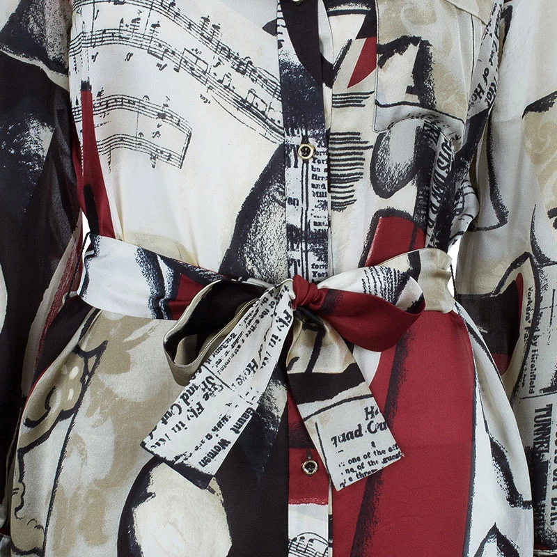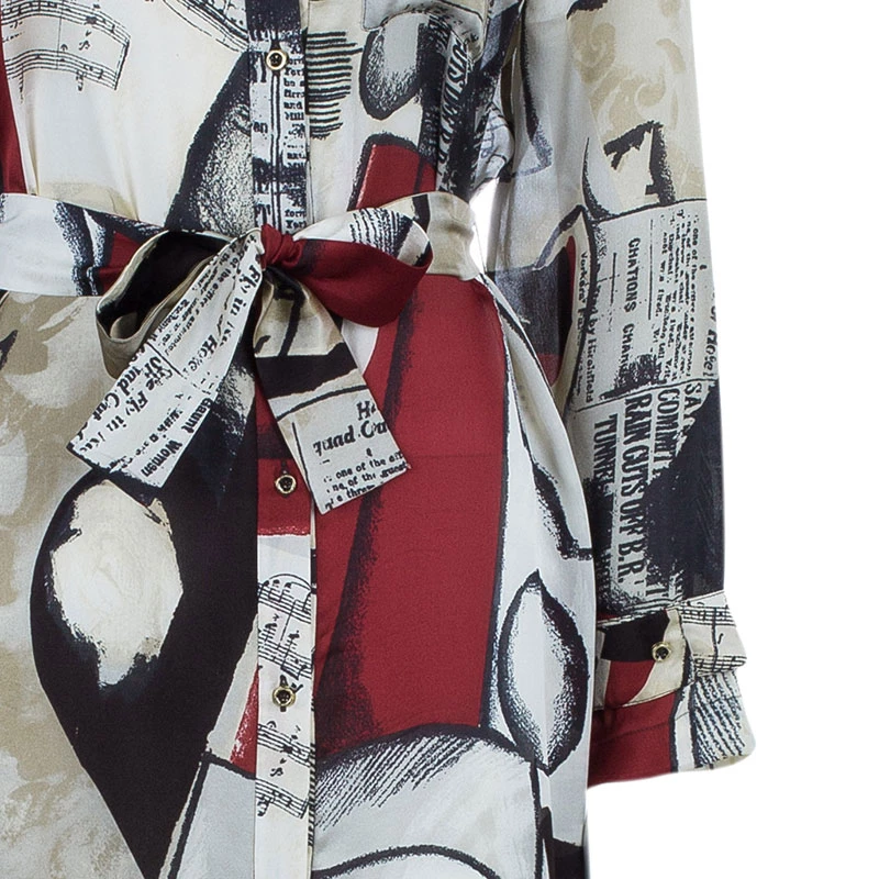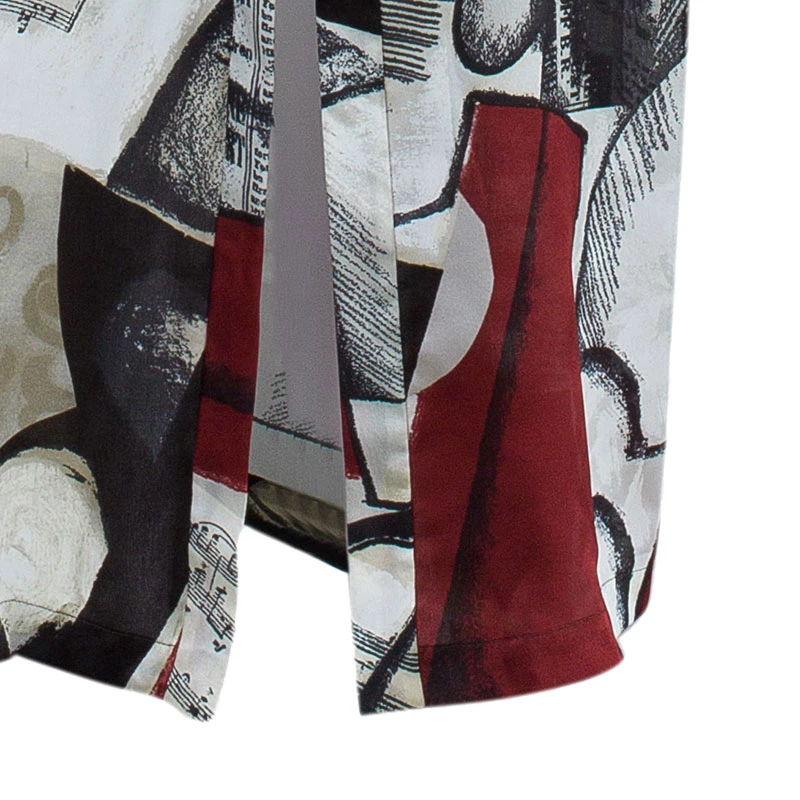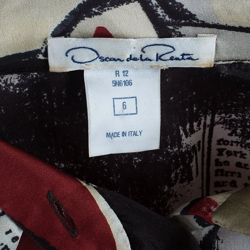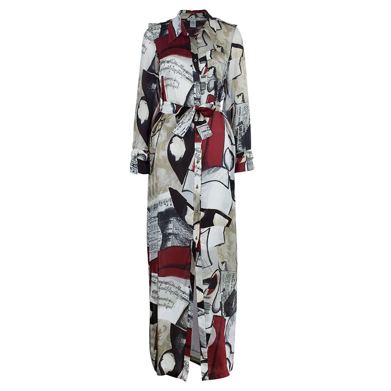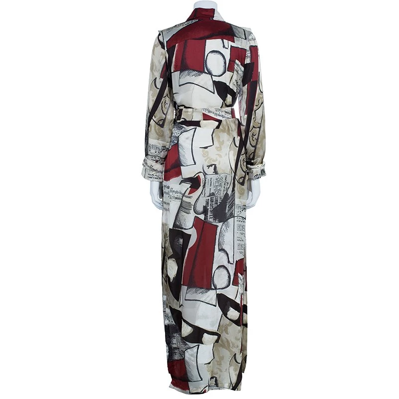 This Oscar de la Renta maxi dress is a perfect dress for summer evenings. Crafted from silk, it features a bold multicolored abstract print. Very light and flowy for easy movement, the floor-length dress comes accented with a fabric belt tied at the waist front. It features a collared neckline and a full front button closure, leaving a vent that adds to the glam effect. The long sleeves are accentuated with cuffs.