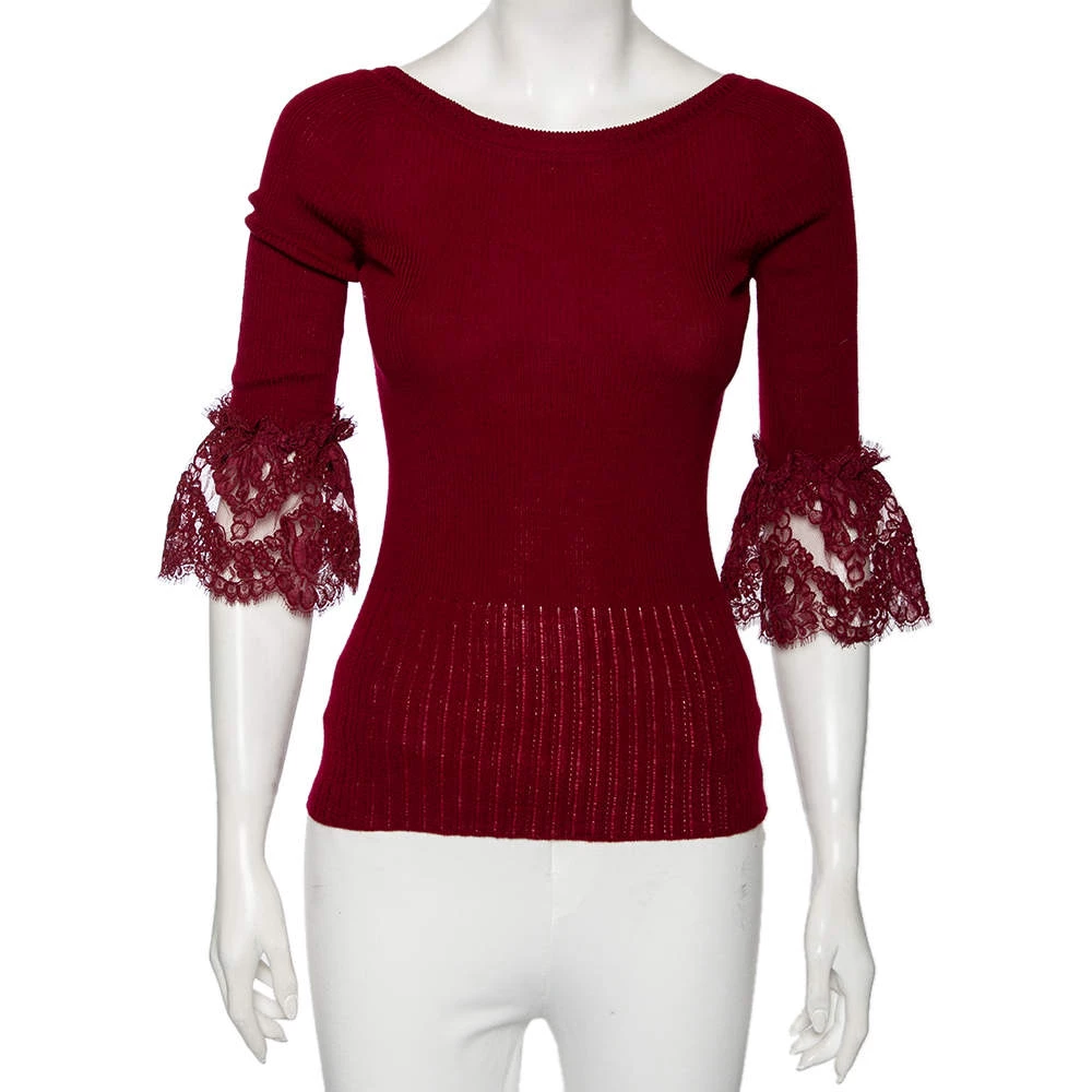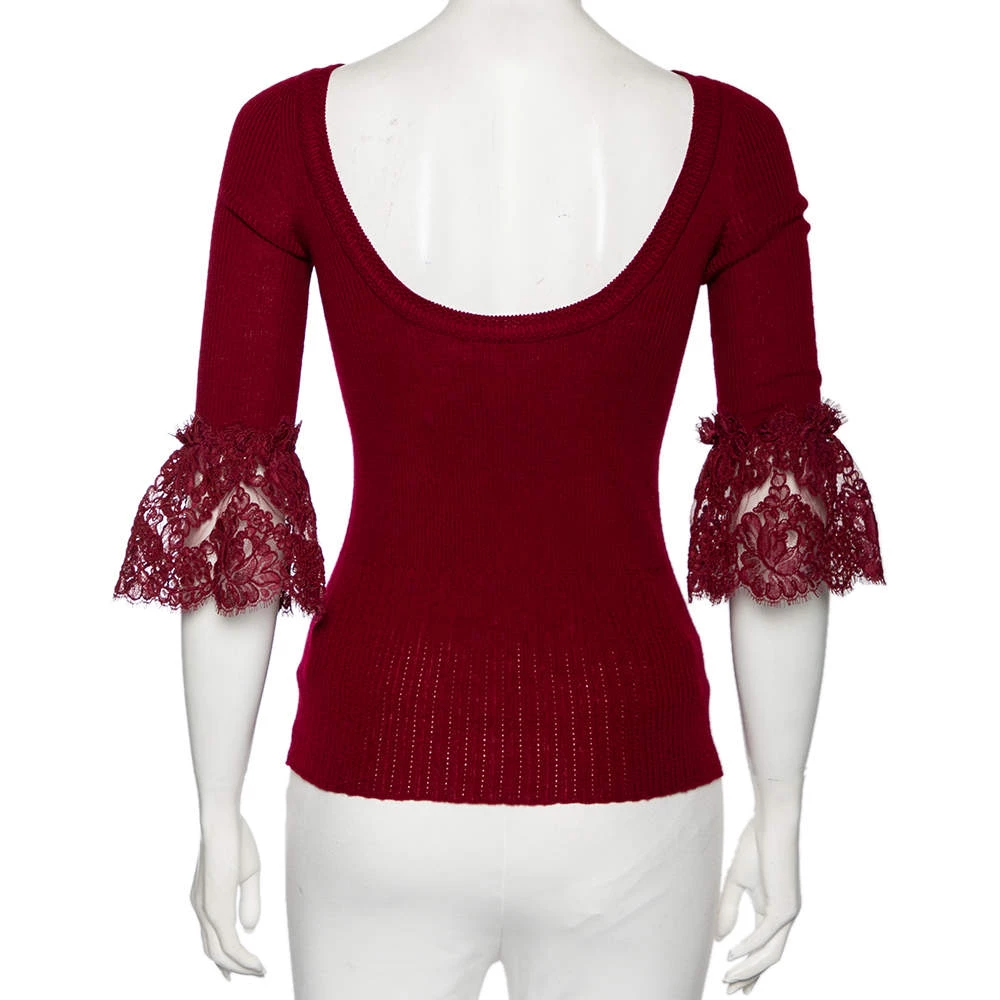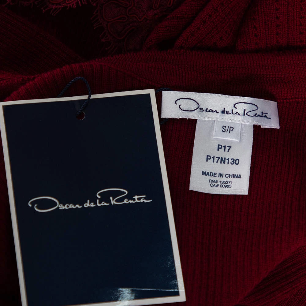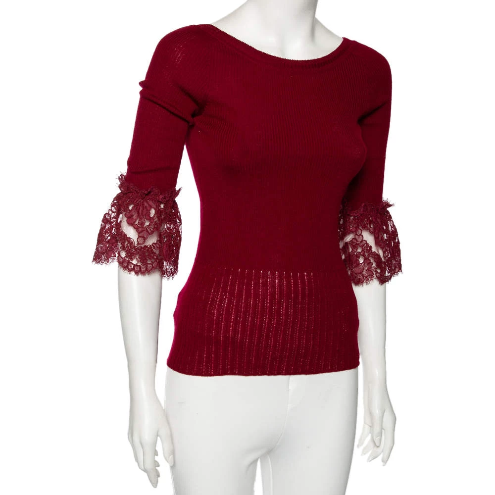 Elevate your wardrobe with this lovely top from Oscar de la Renta. Tailored with utmost intricacy, this long-sleeved top is made with red wool that shows lace detailing on the sleeves. This top can be best paired with black trousers and pumps to achieve a polished look.