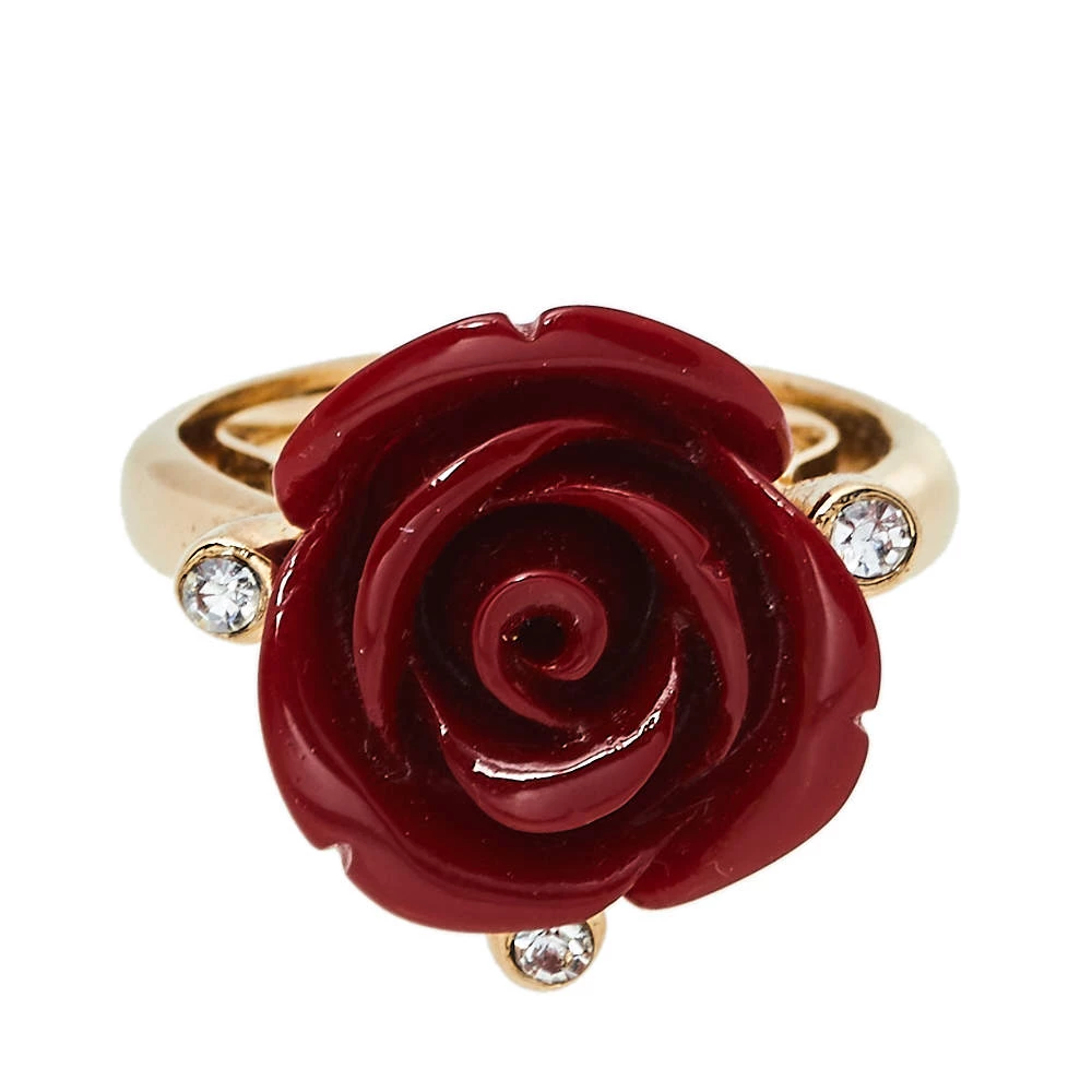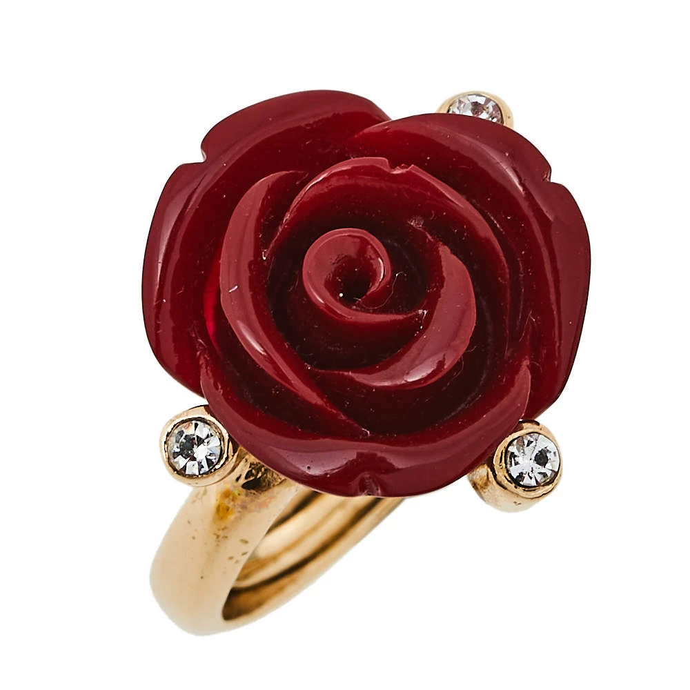 This cocktail ring from Oscar de la Renta is sure to brighten your heart. The ring is crafted from gold-tone metal and beautifully set with a rose that is accompanied by dazzling crystals on the prongs. The statement ring can be worn for your special occasions!