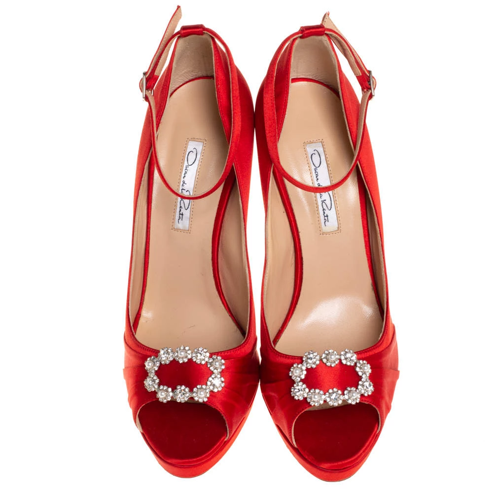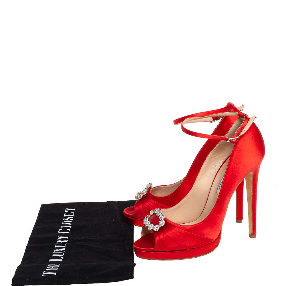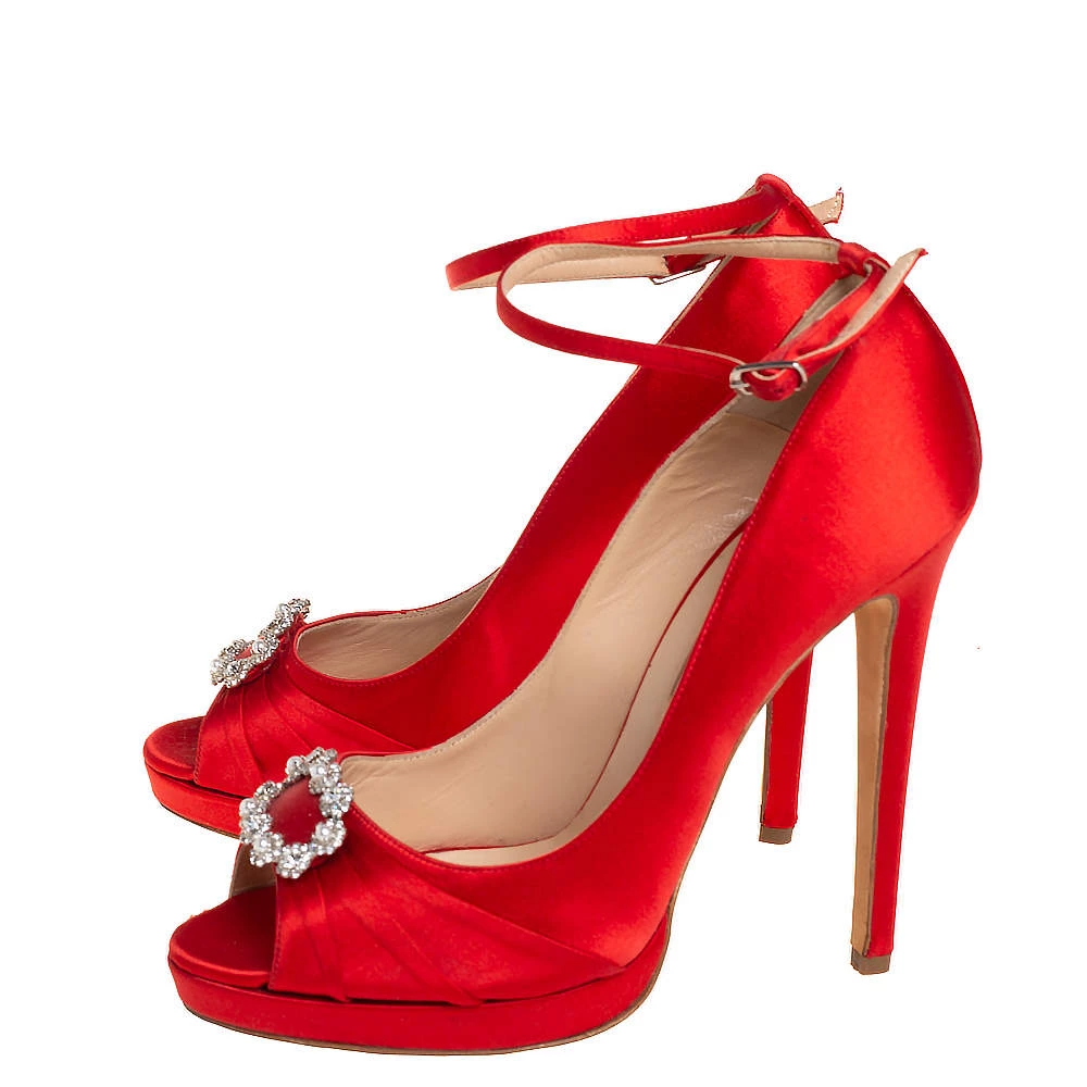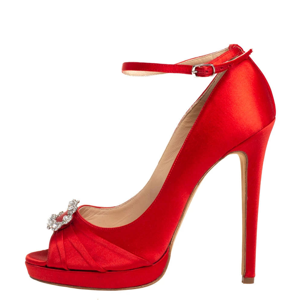 Flaunt your love for fashion when you wear these sandals from Giuseppe Zanotti. Keep it chic and stylish in this pair of red sandals designed from smooth satin. They are styled with peep-toes, crystal embellishments, buckled ankle straps, 14.5 cm heels, and silver-tone hardware.