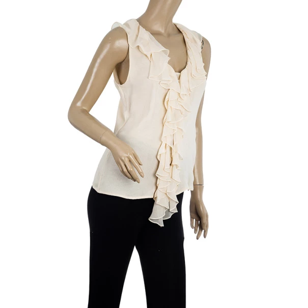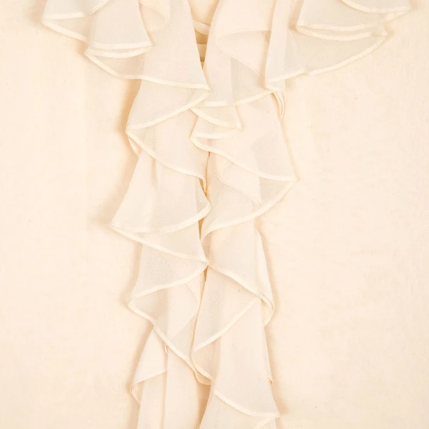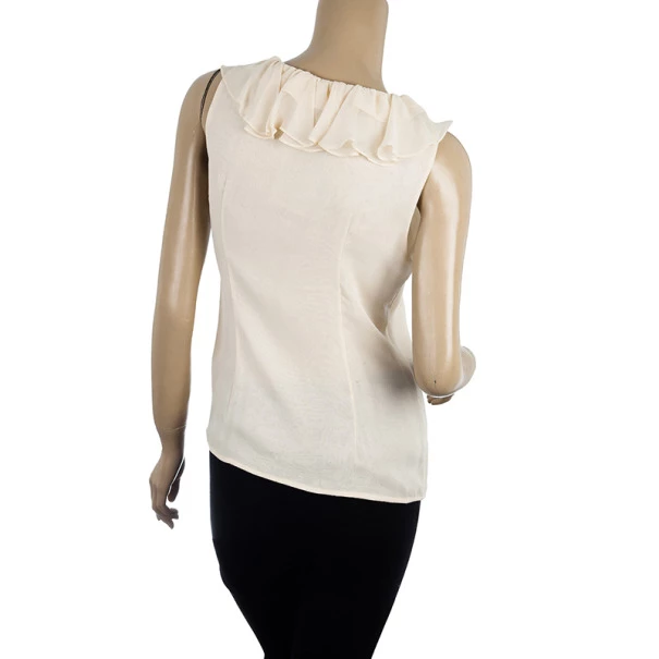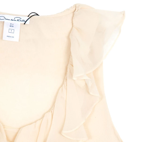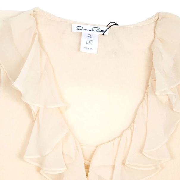 Add a ruffled touch to a formal outfit with this Oscar de la Renta Ruffled Neck Top S. It is made from silk and comes with a v-neck.Original Retail Price:US $594