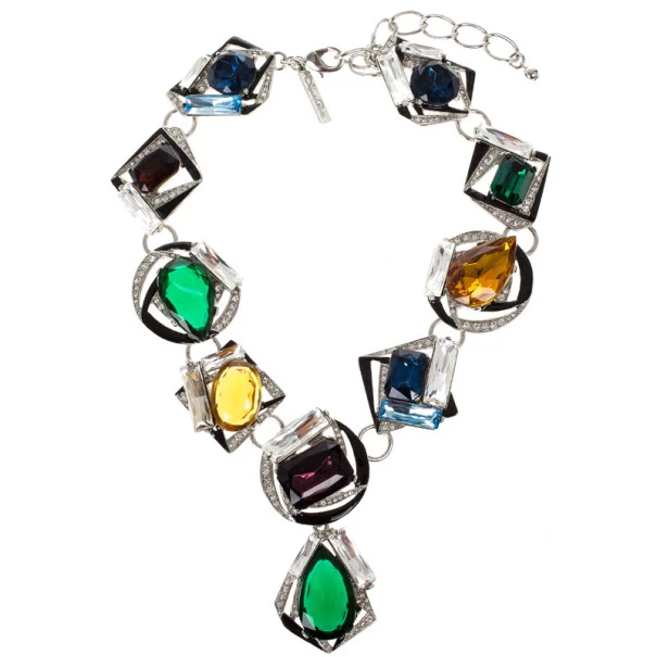 Let this Oscar de la Renta statement necklace adorn your neck and give your simple outfit a pop of color. Made from rhodium-plated metal, its multicolored faceted Swarovski crystals are coupled with clear pave-set crystals, black enamel detail, and a designer-stamped metal tab. This necklace has lobster clasp fastening for easy wear.Original Retail Price: US $918
