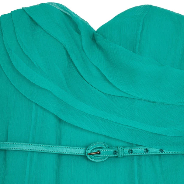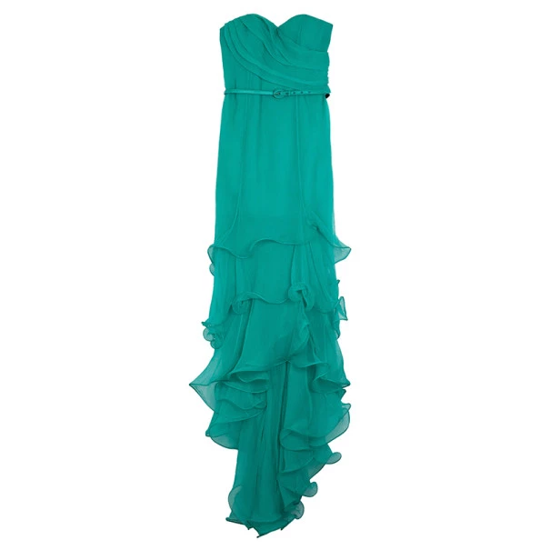 Turn all eyes on you when you slip into this Oscar De La Renta Sweetheart Bodice Ruffled Hem Long Gown. Made from silk, this gorgeous gown features a waist belt, chiffon pleats, a ruffled asymmetrical hem and a waist belt.