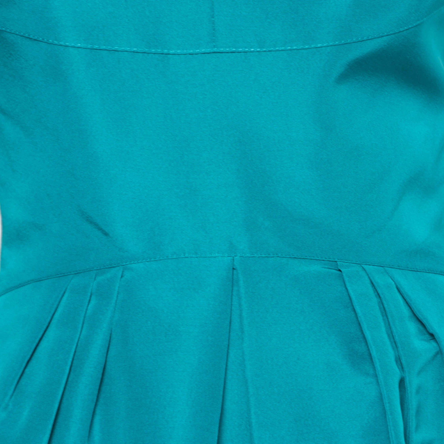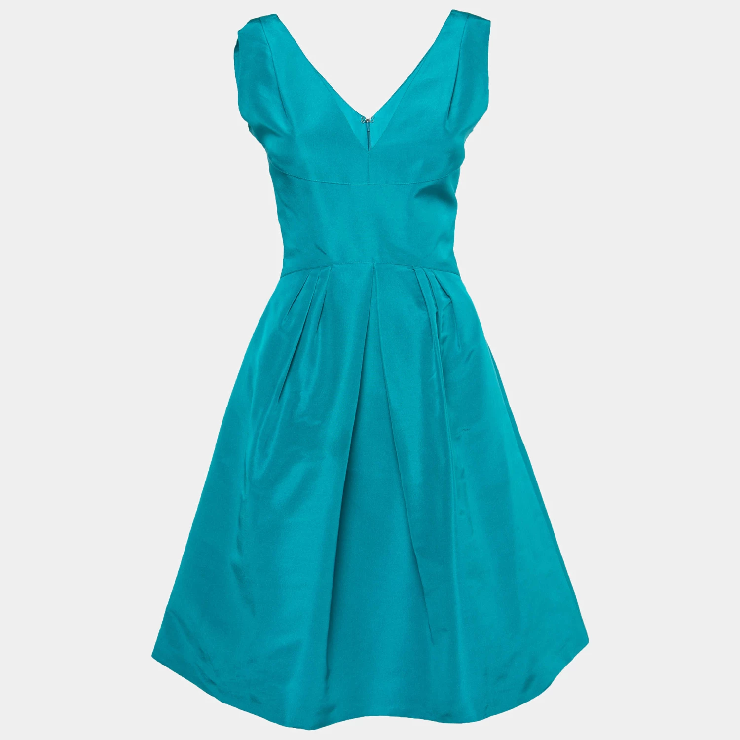 Oscar de la Renta brings elegance and poise to your ensemble with this gorgeous dress. Styled minimally, this dress is fashioned in teal silk fabric and highlighted with pleated formations. It has a sleeveless style, a zipper fastening, and two pockets. Match this dress with a pair of ballet flats for a chic style.