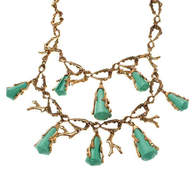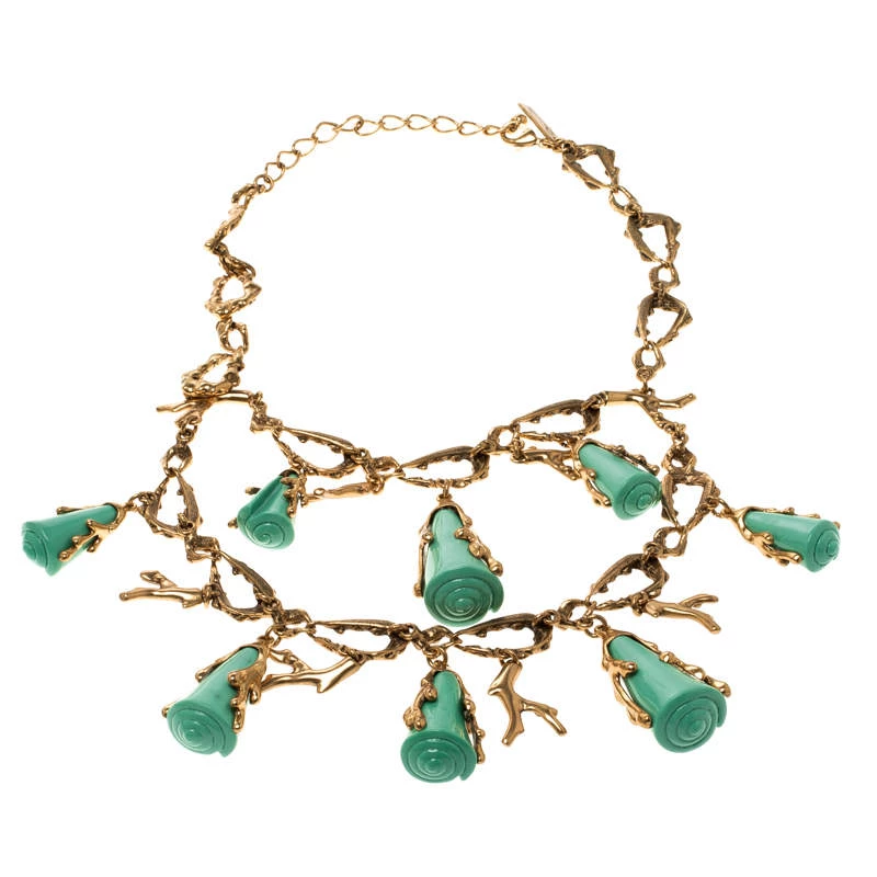 A stunning Oscar De La Rents two tier necklace that is perfect for day time casual and even party looks. Constructed in gold tone metal, this necklace features coral accents connected together and delicately harbouring the most beautiful turquoise resin shells in them for a distinct feminine and bohemian look.