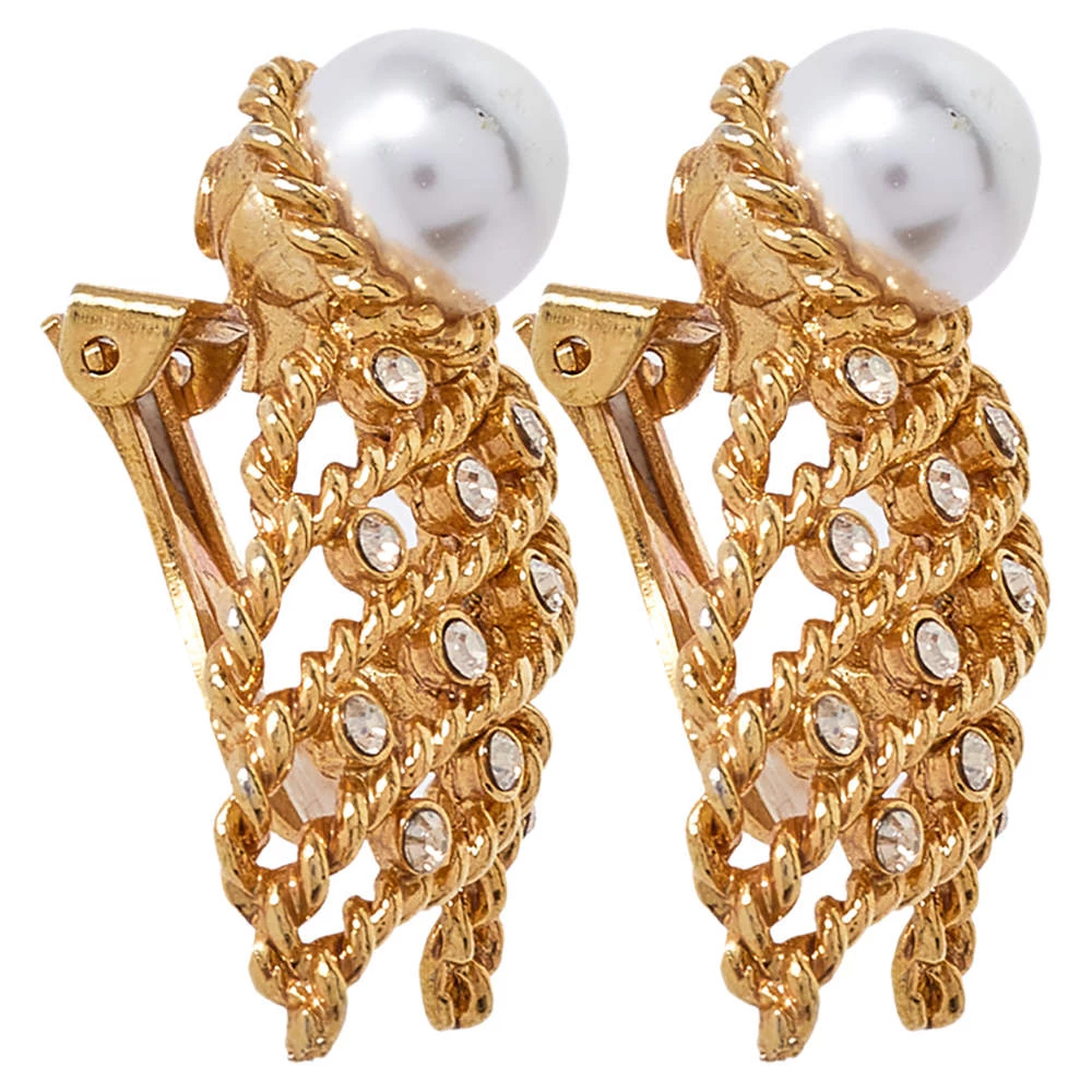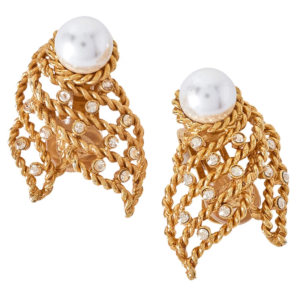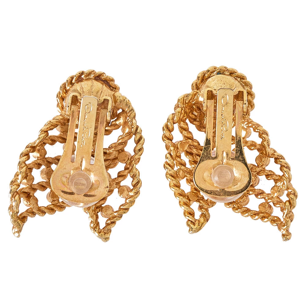 These Oscar de la Renta Vintage earrings feature a faux pearl and crystals on a twisted cage-like layout to project a mesmerizing end result. Designed using gold-tone metal, they are eye-catching and comfortable. The perfect gift for a jewelry lover or the perfect addition to your existing collection of earrings is this pair.