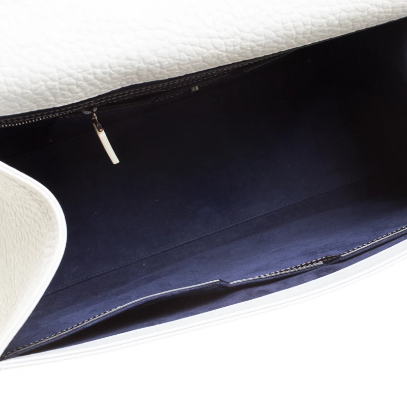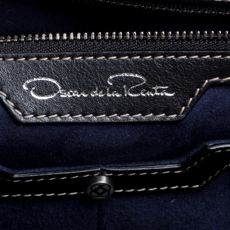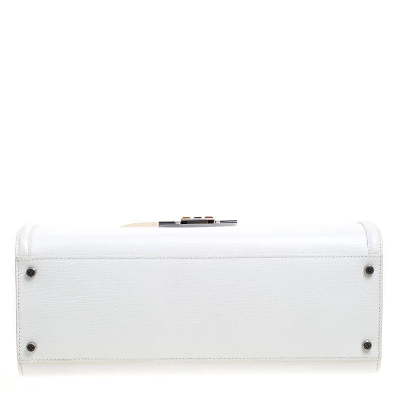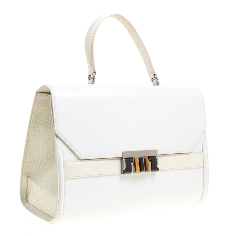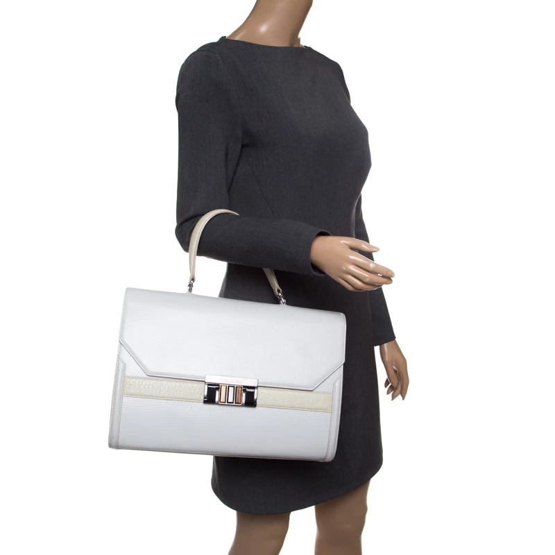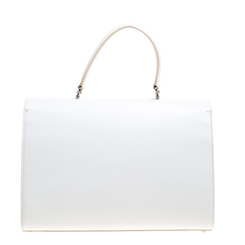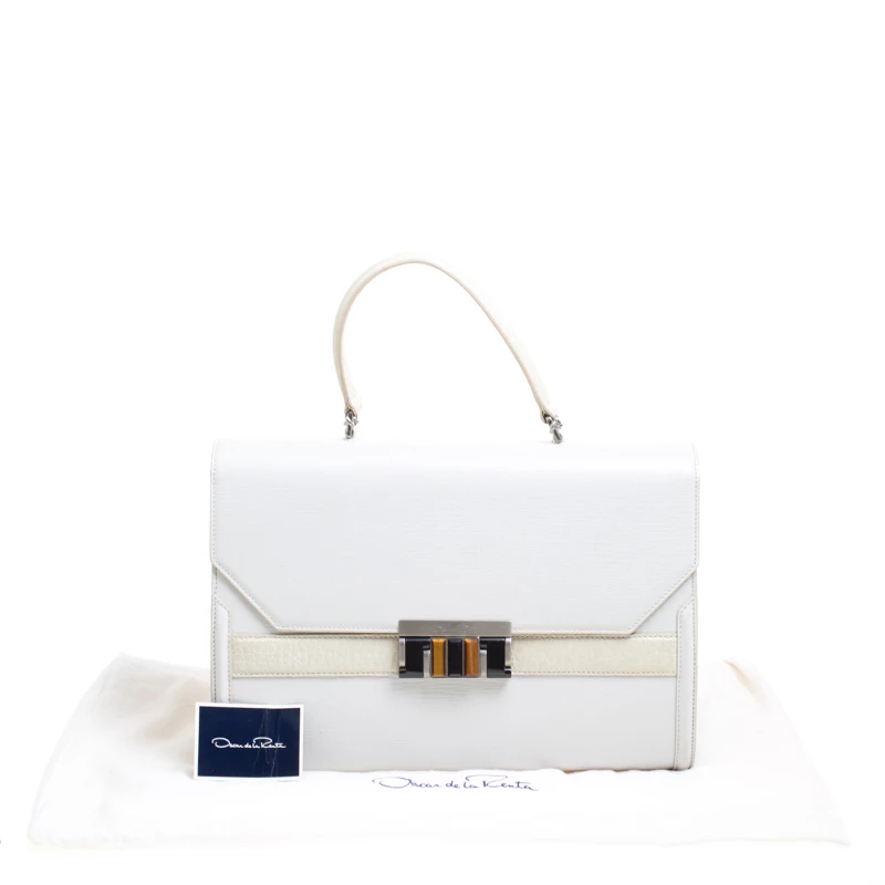 Hints of class and luxury define this Oscar de la Renta bag. Designed in a structured silhouette, this bag is crafted in white and cream leather and arrives with a classic top handle that will tote effortlessly over your arms. The sizeable piece will safely house your basics in its Alcantara-lined interior. Complete with silver-tone hardware and protective metal feet, this beauty is a luxury worth possessing.