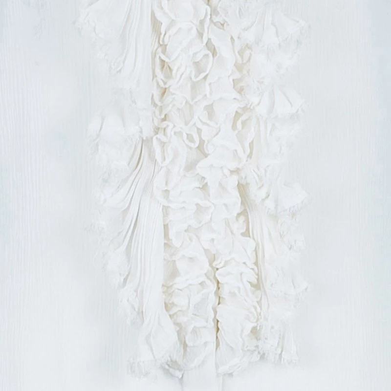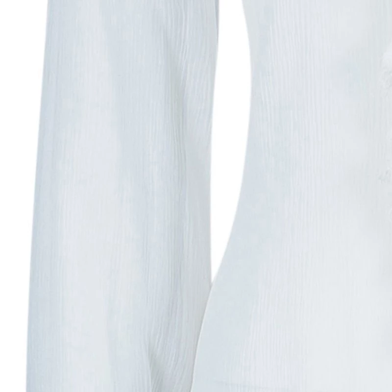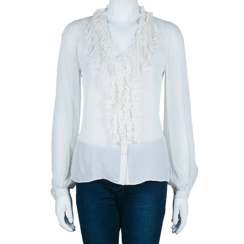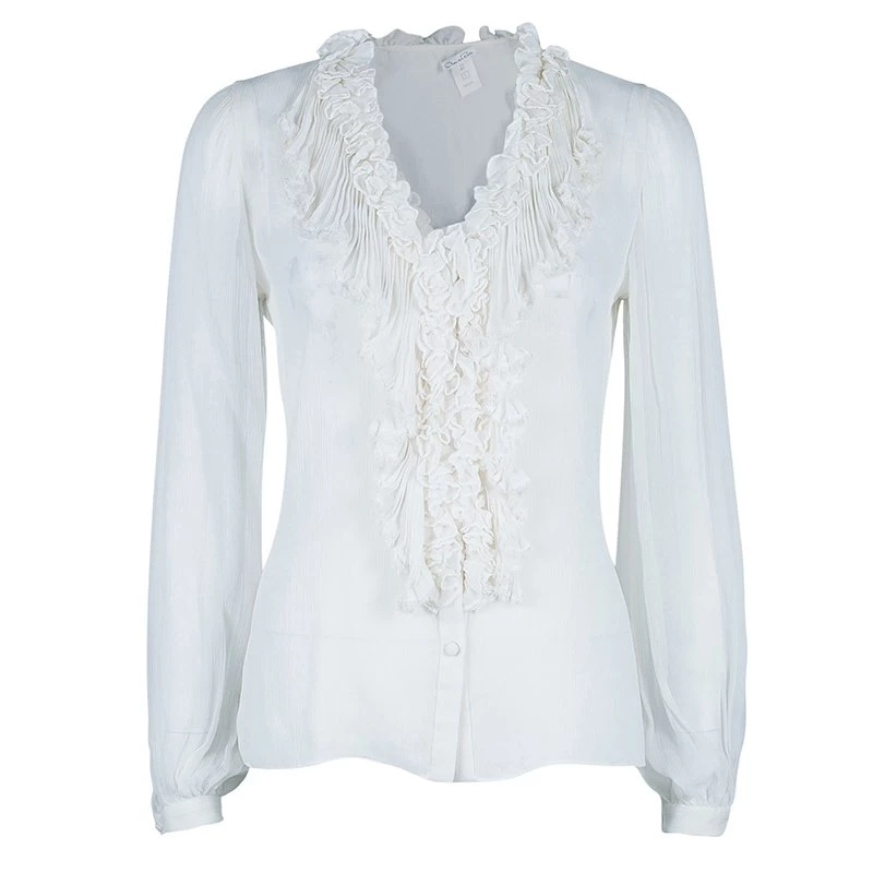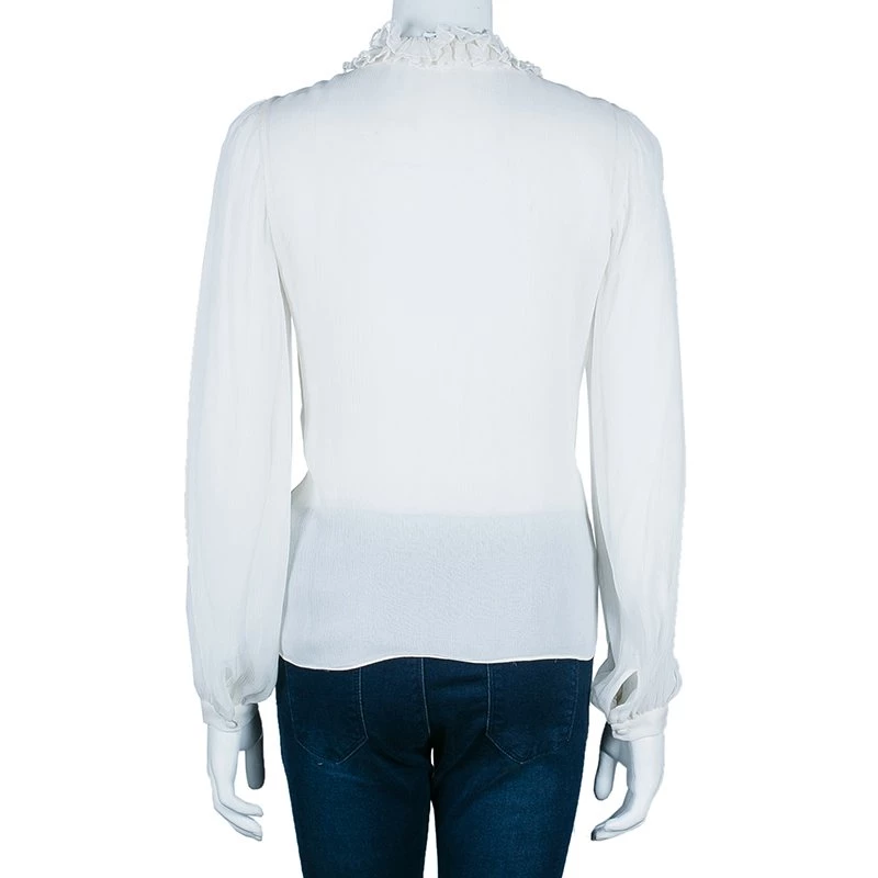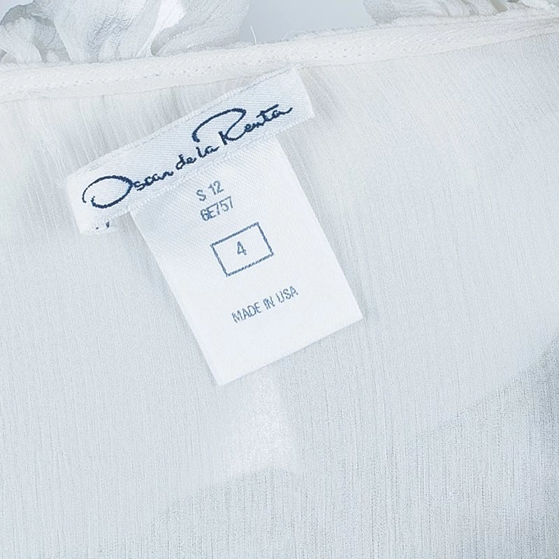 White is beautiful and so is this stunning Oscar de la Renta top. The chiffon crinkled detailing around the neck and at the front is simply gorgeous. It features full sleeves with cuffs. Wear this with denim jeans or a long straight skirt for a splendid look.