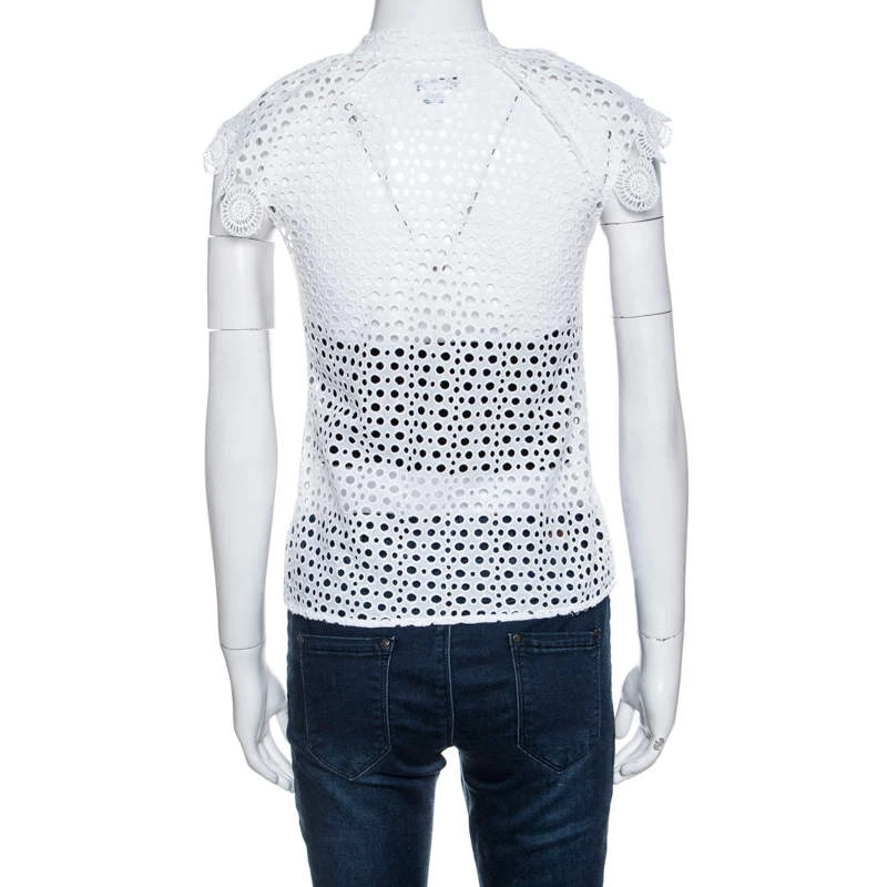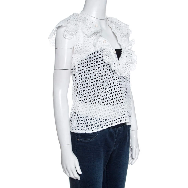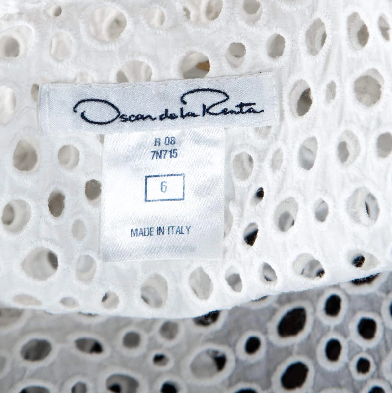 Lend a modern take on fashion with this excellent Oscar de la Renta top. This white top has eyelets all over and ruffles lace trims on the neckline. Adorned with a gorgeous design, this beautiful top is made from 100% cotton.