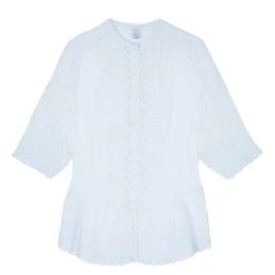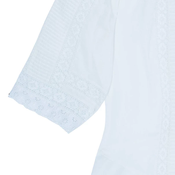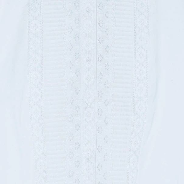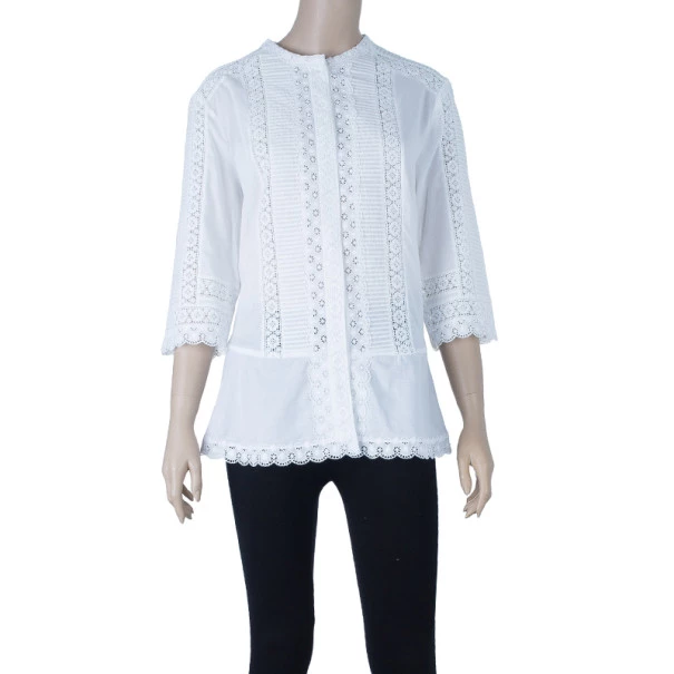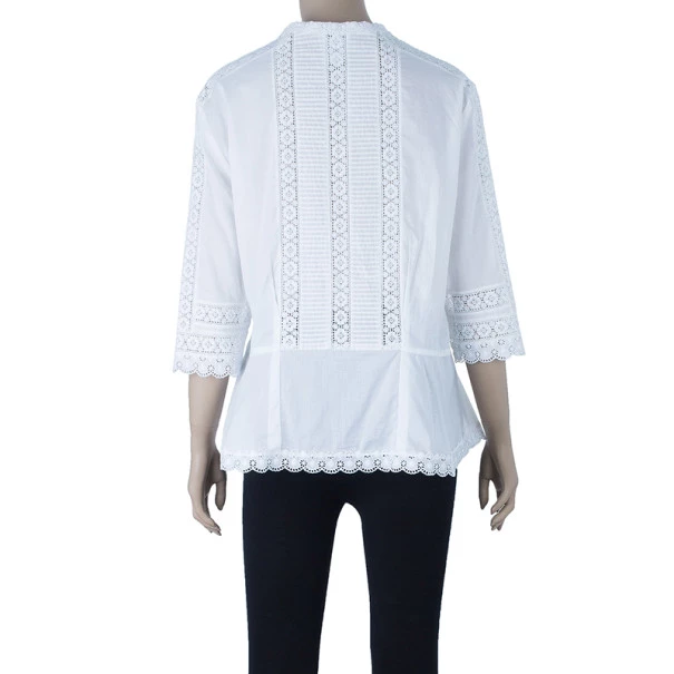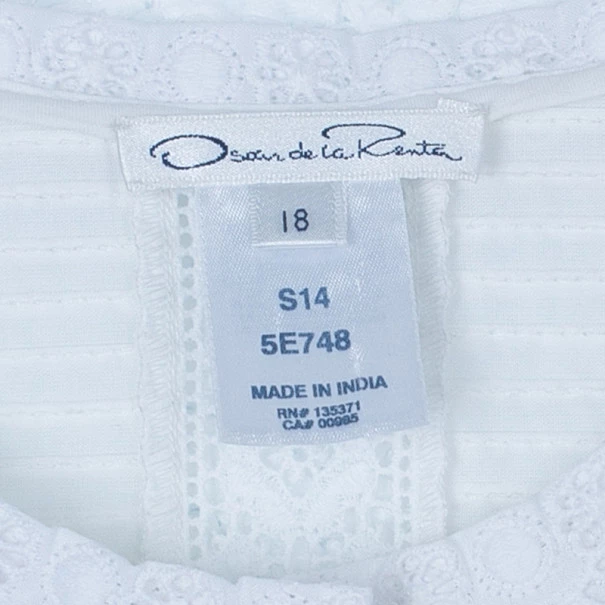 Look effortlessly chic and casual in this Oscar De La Renta White Eyelet Top. Made from cotton, it features subtle floral embroidering all over. It has a rounded neckline, button down closure and peplum motifs at its bottom.Original Retail Price: US $1,856
