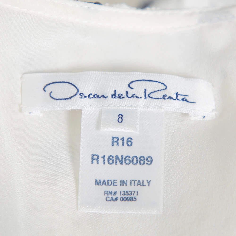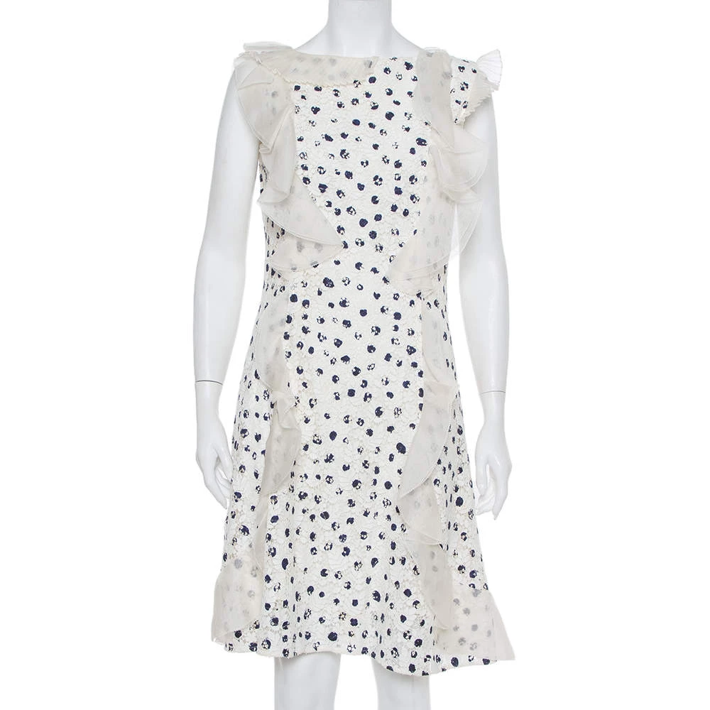 This Oscar de la Renta creation is not a simple white dress. It is formed into an elegant shape using lace and beautified with painted effect all over, sheer ruffle trims, and pleated panels. Secured by a back zipper, the dress can be complemented with high heels or flats.