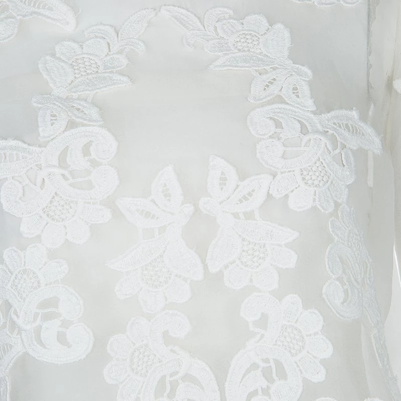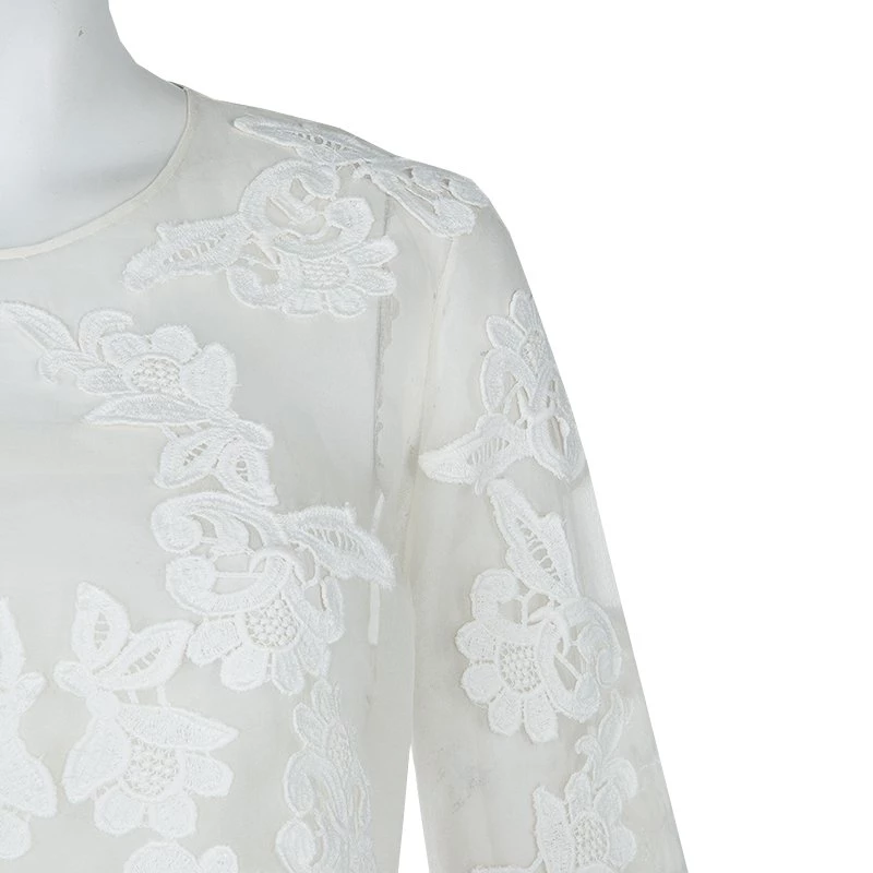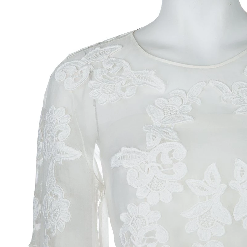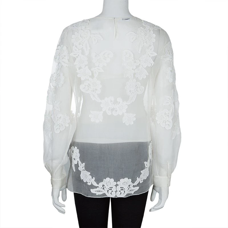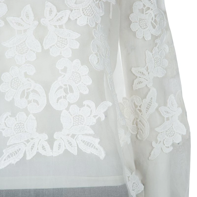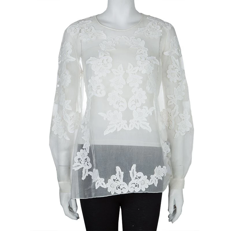 This pleasing and angel like top coming from Oscar de la Renta will leave the crowd gazing at you in awe. Crafted with sheer silk, it is adorned with the praiseworthy floral appliqué detailing. This top is accentuated with a laudable round neckline, long sleeves, and a rear hook.