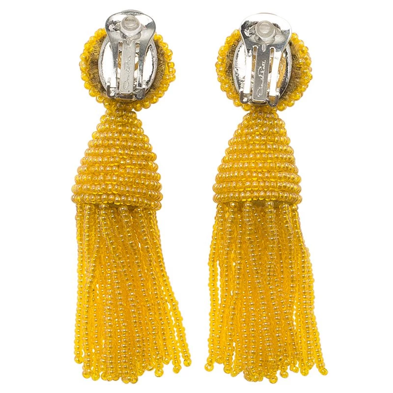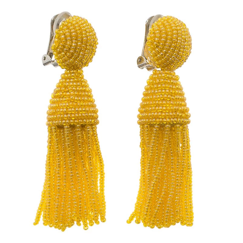 These comfort-padded clip-back bright yellow earrings are made of glass beads. The top globular piece holds an inverted cone with strings of beads hanging down like tassels, accentuating the neck.