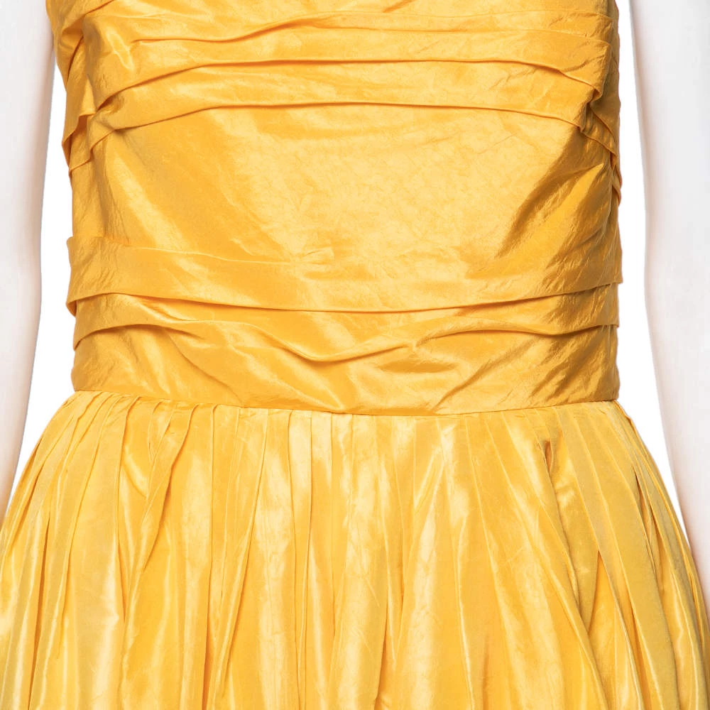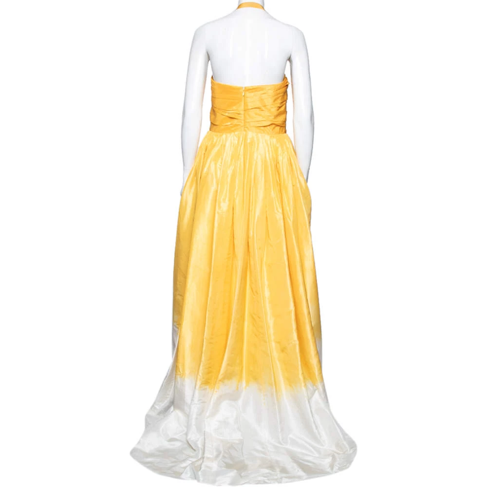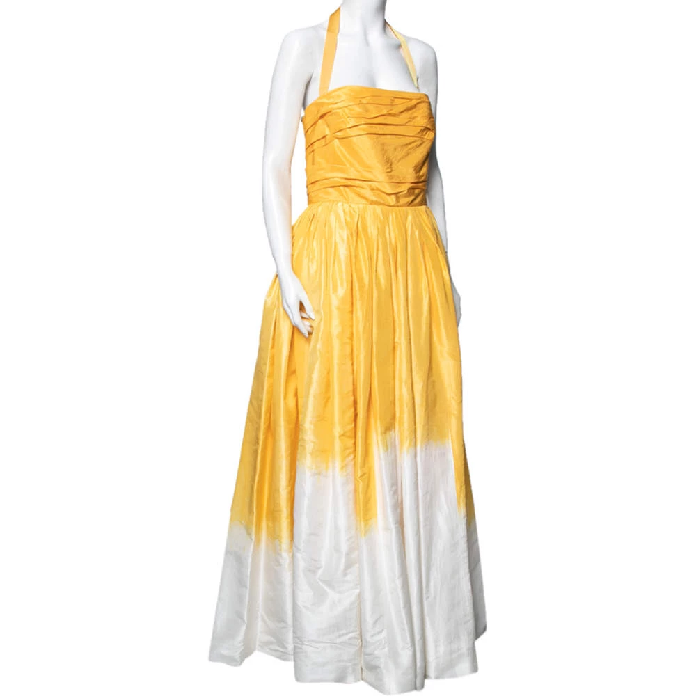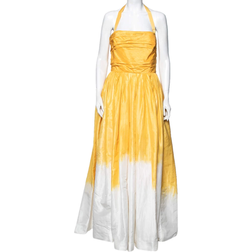 Step out for the evening like an absolute diva wearing this gorgeous yellow gown. Designed by Oscar de la Renta, the beautiful gown is an exemplar of women’s luxury wear. It is tailored exquisitely using dip-dyed silk taffeta in a flowy style and ruched detailing on the floor-length silhouette. To make it stand out, pair it with statement jewelry and stilettos.